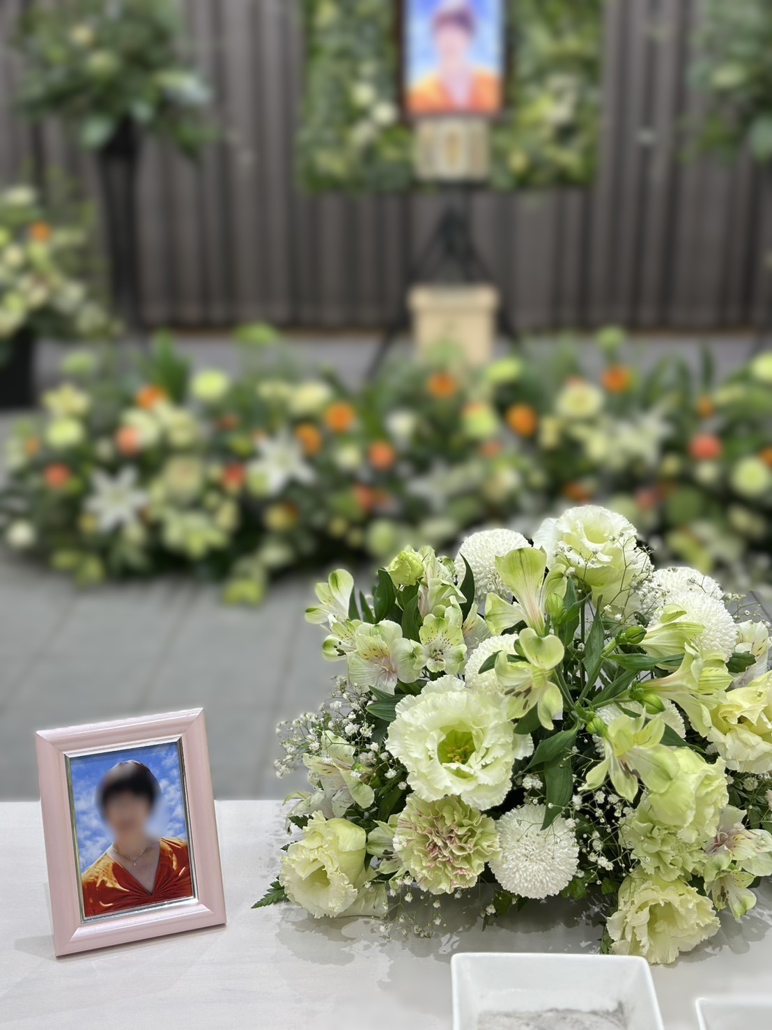 奥様が大好きだったオレンジ色の花を入れたオリジナル花祭壇